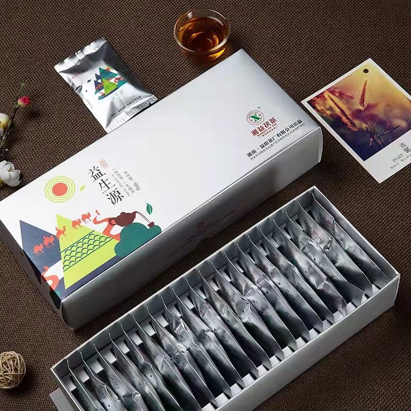 益生源茯茶整體的設計區(qū)別于益陽茶廠其他產品,包裝素雅清新,茯茶采用進口尼龍袋包裝,超聲波封口機封口,確保其安全性。打開包裝可見20包茶整齊排列,抽出一包即為一泡,一泡5g。
