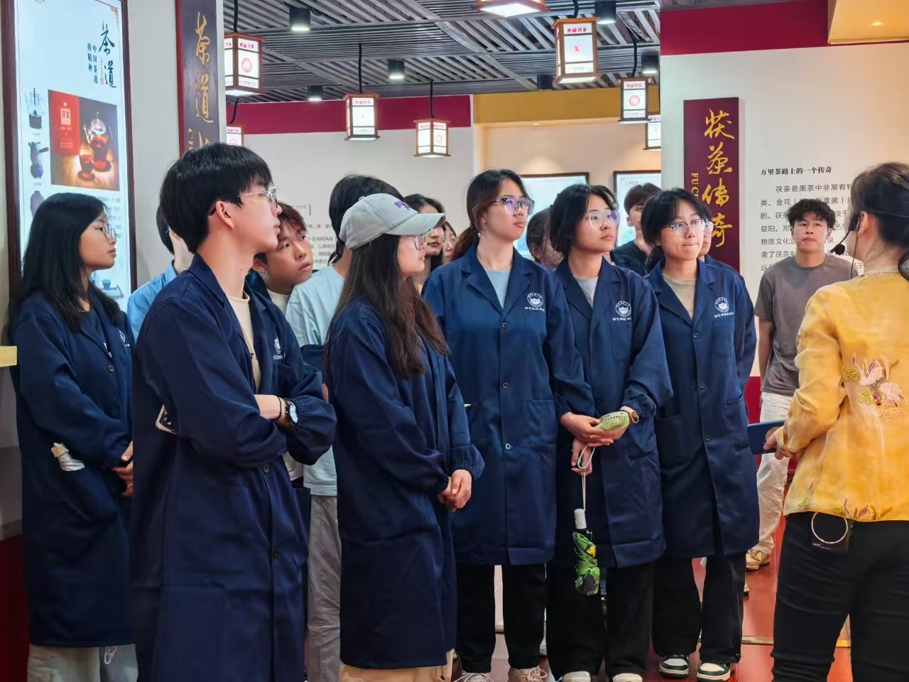 師生們首先實(shí)地參觀了湘益生產(chǎn)線與茶博館。在生產(chǎn)車(chē)間,同學(xué)們親身感受益陽(yáng)茶廠標(biāo)準(zhǔn)化、現(xiàn)代化的生產(chǎn)流程,對(duì)茯磚茶的制作工藝有了初步直觀的了解。茶博館內(nèi)陳列的一件件展品,則如同一部生動(dòng)的茶文化史書(shū),讓師生們沉浸式領(lǐng)略益陽(yáng)茶廠深厚的文化底蘊(yùn),探尋茯茶的前世今生,深刻體會(huì) “一片茶葉承載的使命”。