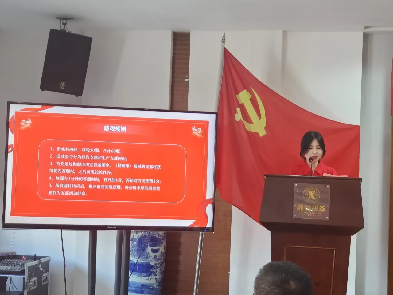 紅色知識與廠史知識問答環(huán)節(jié)開始,大屏幕上題目涵蓋黨的歷史、重要會議、革命英雄事跡及廠史知識。行政支部與生產(chǎn)支部黨員全神貫注答題,答對題目現(xiàn)場掌聲熱烈。黨員們鞏固黨性知識,加深對黨史廠史理解,認(rèn)識到紅色政權(quán)、新中國、中國特色社會主義及單位發(fā)展成果來之不易。