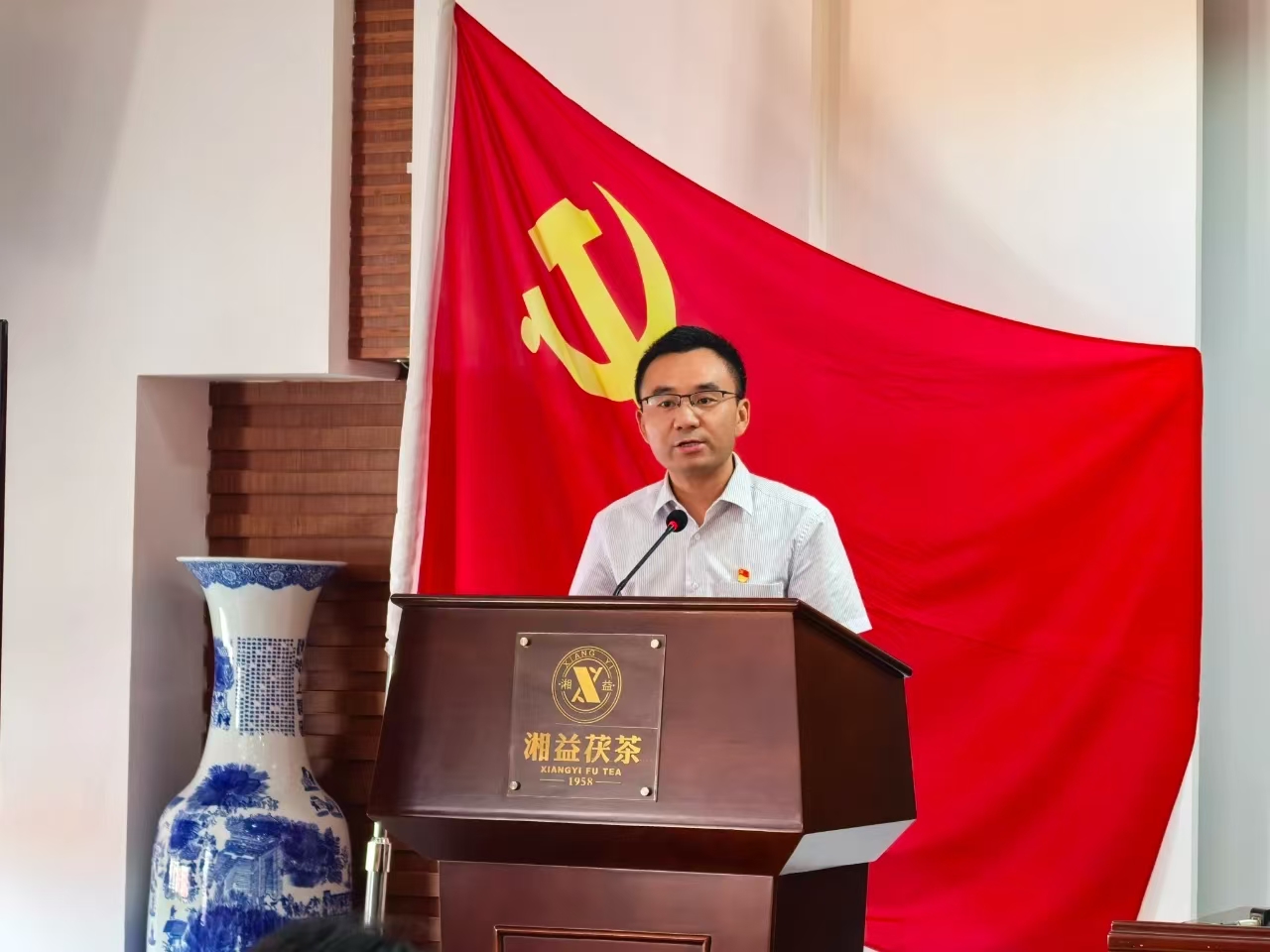 7月1日,在黨的104周年華誕這個特殊的日子里,湘益茯茶全體黨員精神抖擻地齊聚公司6樓會議室。在生產(chǎn)支部書記安茂強的帶領(lǐng)下,全體黨員高舉右拳,面向鮮紅的黨旗莊嚴(yán)宣誓。鏗鏘有力的誓言在會場回蕩,仿佛穿越時空,喚醒了每位黨員入黨時的赤誠初心。這一刻,信仰的力量在胸中激蕩,奮斗的熱情在心中燃燒。