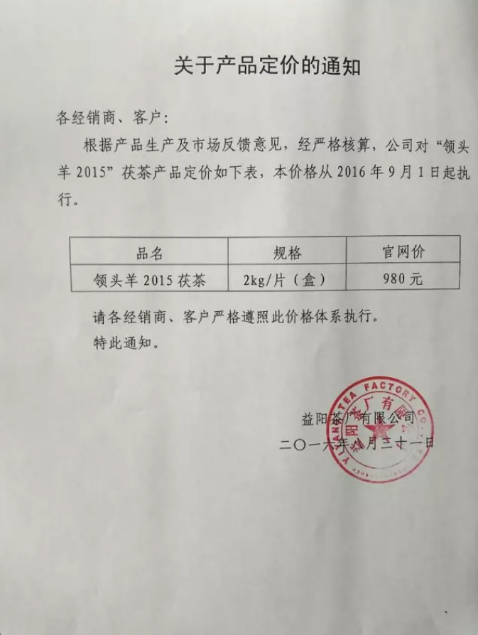 根據(jù)產(chǎn)品生產(chǎn)及市場反饋意見,經(jīng)嚴(yán)格核算,公司對“領(lǐng)頭羊2015”茯茶產(chǎn)品定價(jià)如下表,本價(jià)格從2016年9月1日起執(zhí)行。